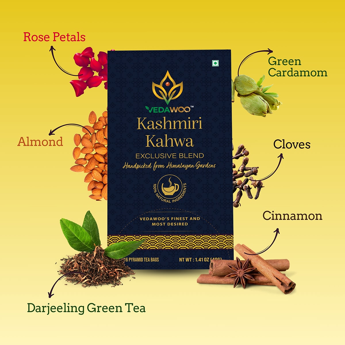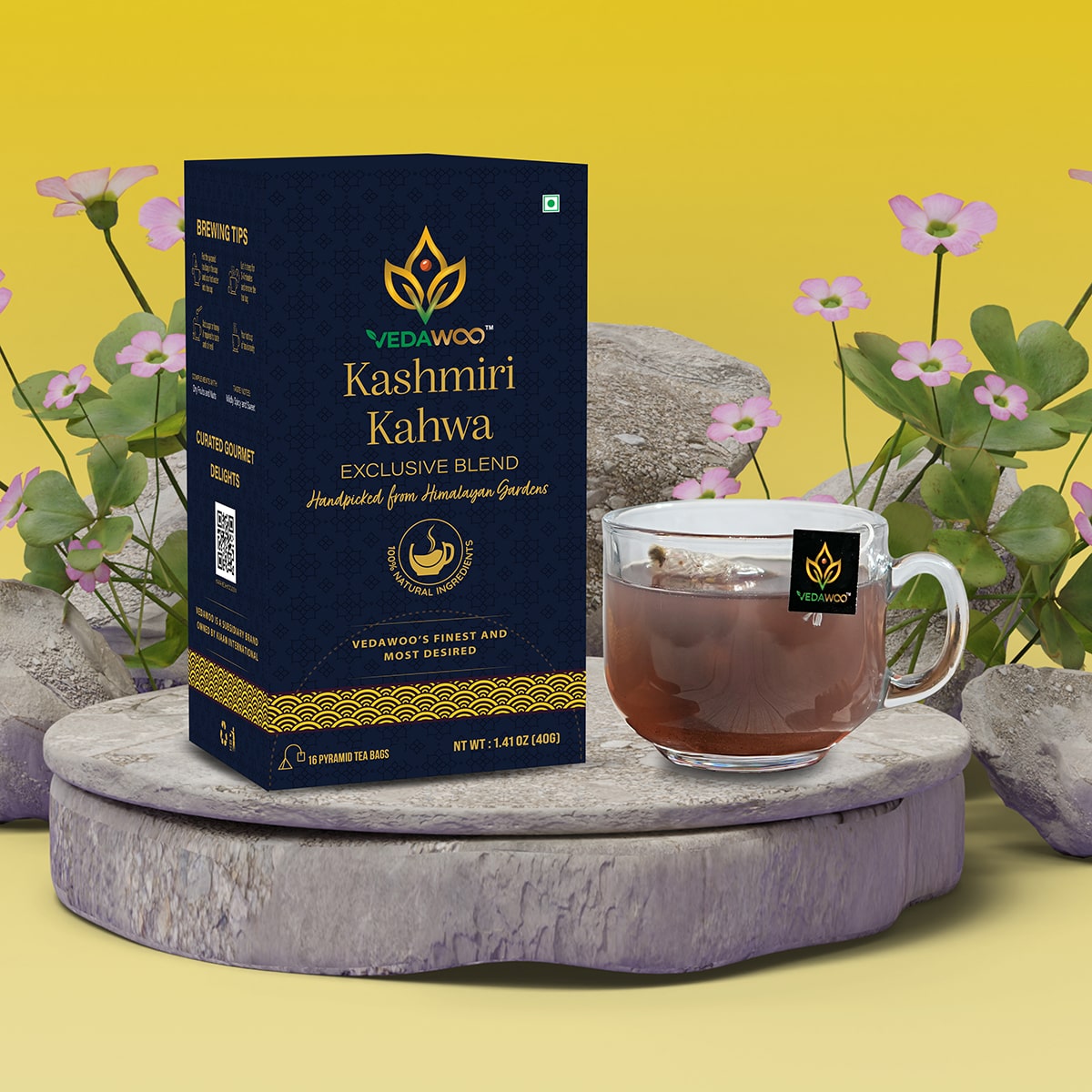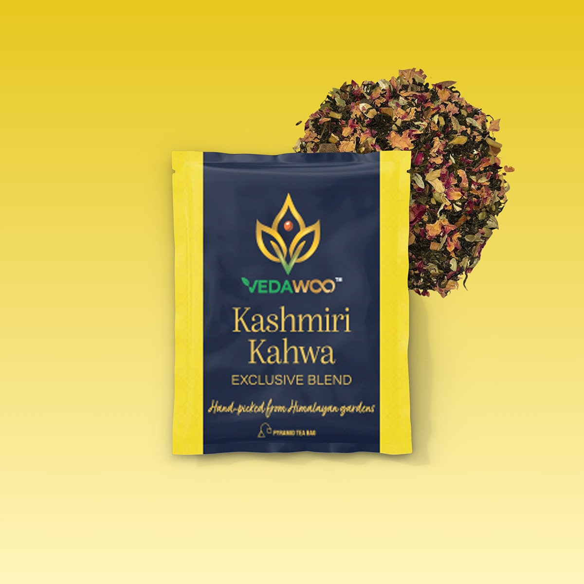 Experience the enchanting allure of Vedawoo’s Kashmiri Kahwa Tea. Sourced from Kashmir, this premium blend of cardamom, & almonds offers a luxurious, aromatic taste that takes you on a journey with each sip.