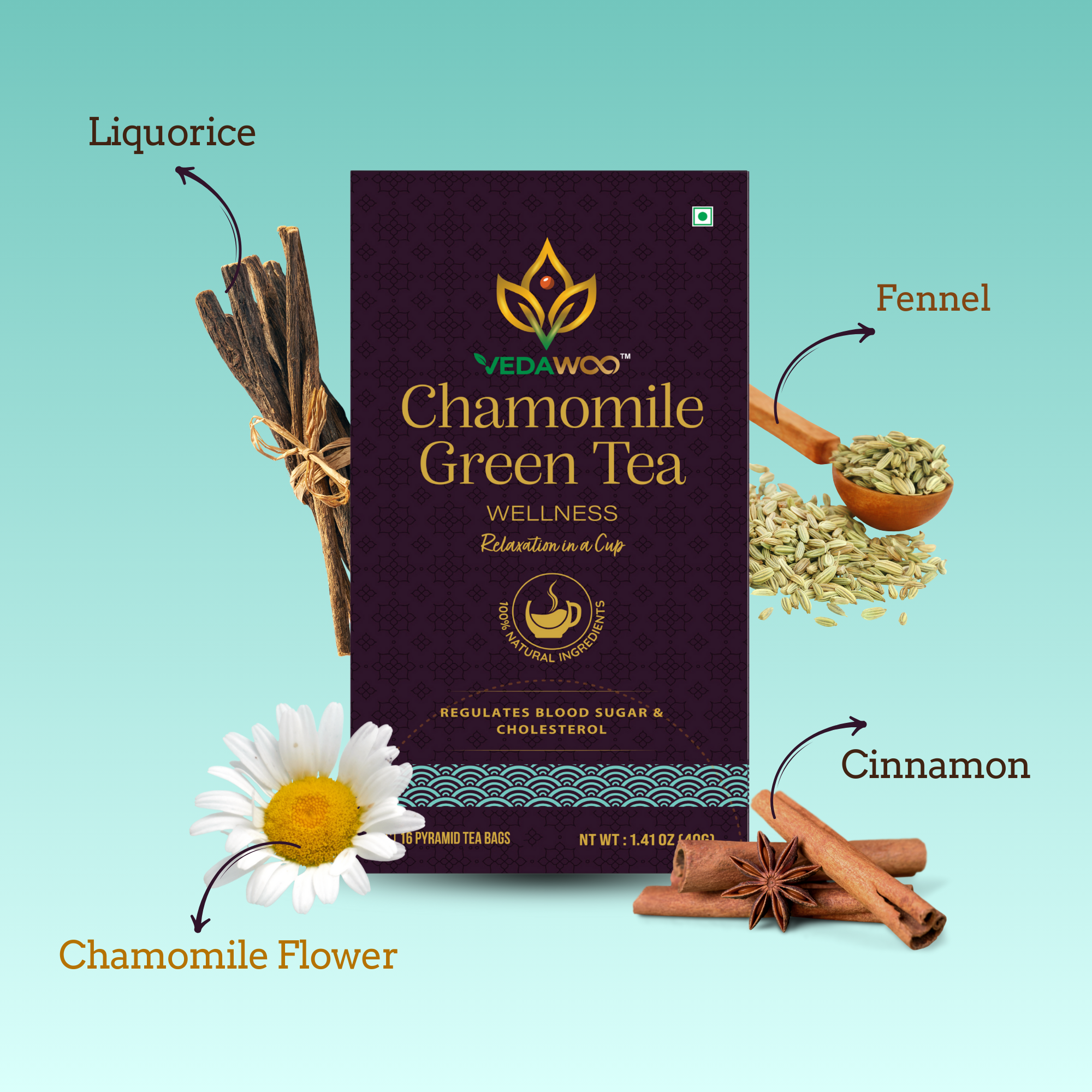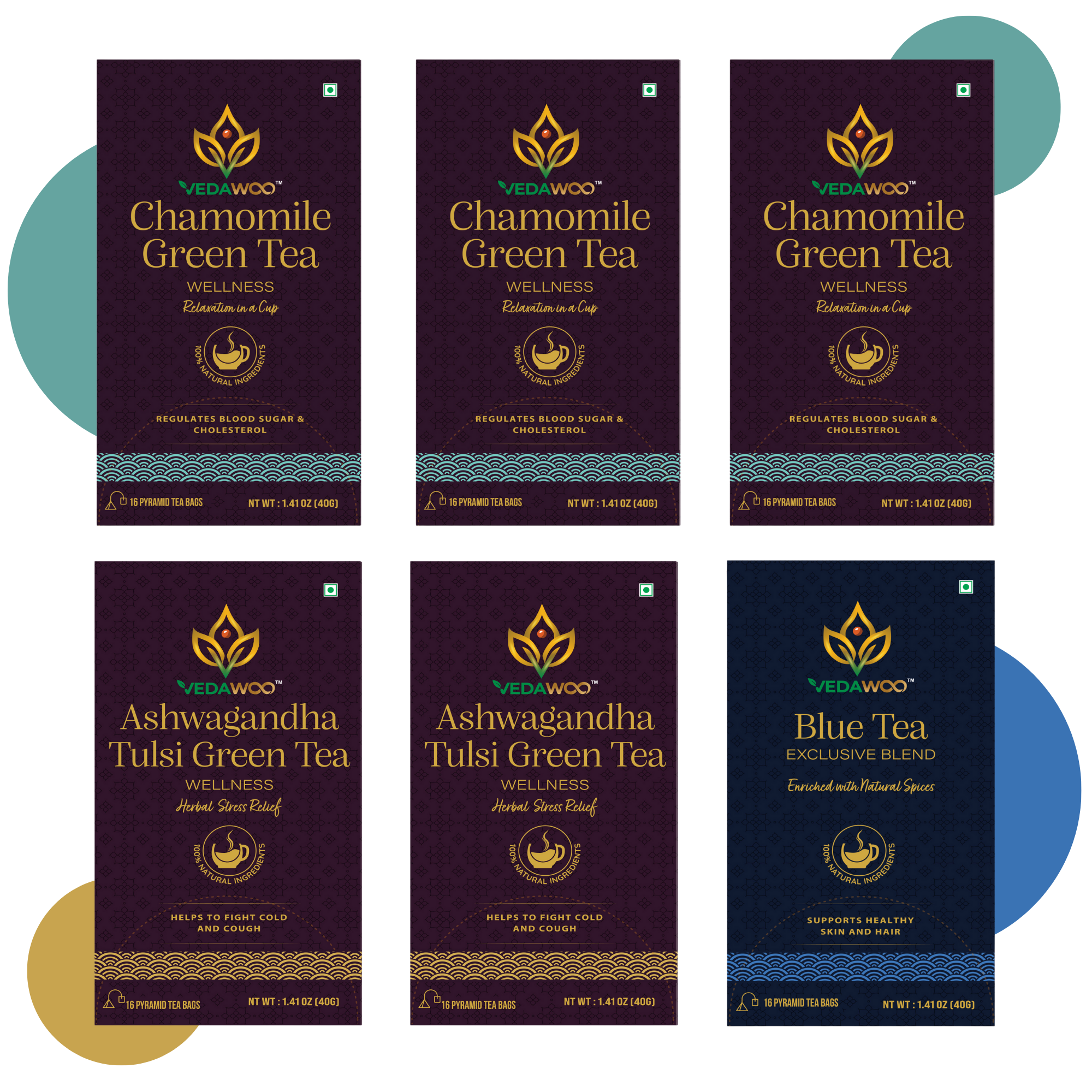 Shield yourself from stress with 3 Chamomile Green Teas, 2 Ashwagandha Tulsi Green Teas, and 1 Blue Tea.